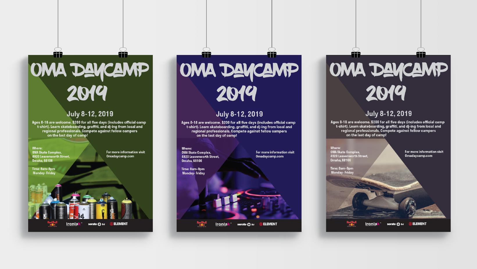 The client wanted three event flyers for Djing, Graffiti, and Skateboarding in that would be for the Omaha area.